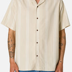 The Cedar Shirt uses lightweight cotton crepe with a printed stripe for an airy, textured feel. Its camp collar and soft structure make it a natural choice for warm afternoons.